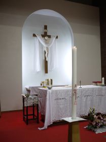 そして,平成17年10月、これらの4教会を統合し、現在地に。「カトリックいわき教会」を建設し、新たな活動を開始した。なお,小名浜、湯本、吻来の3教会は,巡回教会として、遠隔地の信者のために月一回程度の集会祭際義を実施している。また, 小名浜白百合幼稚園」は勿来カトリルク幼稚園」は、現在も、地域の幼児教育に熱心に取り組んでいる。