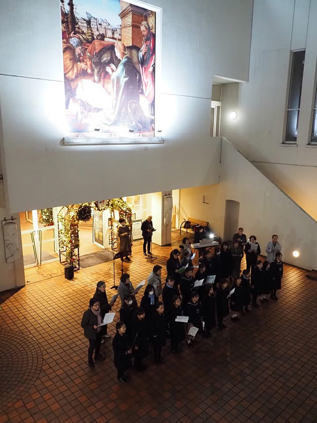 祈りの後、仙台白百合学園小学校合唱クラブの演奏を聞きながら温かい飲み物をいただき、最後は全員で「あめのみつかい」と「もろびとこぞりて」を歌って、平和なクリスマスが訪れる事を願いました。